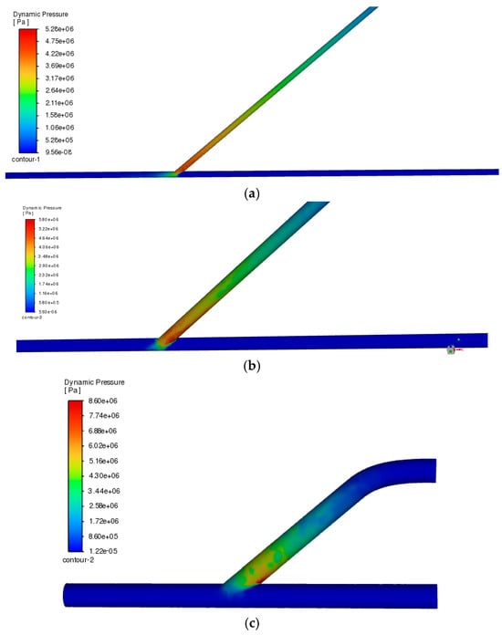 Pressure comparison for the same anastomosis angle with different blood vessel diameters: (a) 2 mm, (b) 5.1 mm, and (c) 14.5 mm. The lesser the red color of the pressure contour along the anastomosis site, the less stress applied and an ideal diameter.