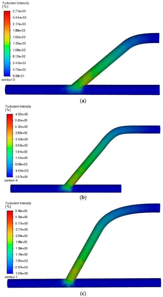Turbulence comparison for same blood vessel diameters with different anastomosis angles: (a) 40°, (b) 50°, and (c) 60°. The darker the color of red at the conjunction of the attached graft and vein, the better the blood flow.
