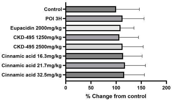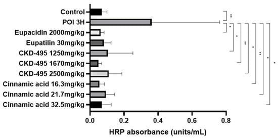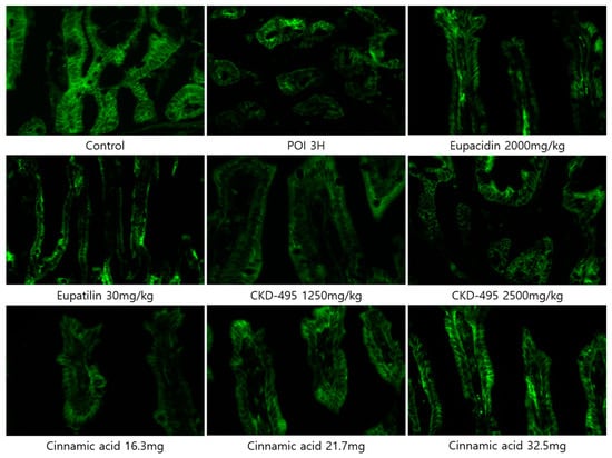 The intestinal permeability was indirectly confirmed through a horseradish peroxidase (HRP) absorbance measurement in six subjects in the normal control group, eight in the POI group, six in the eupacidin 2000 mg/kg administration group, seven in the eupatilin 30 mg/kg administration group, six in the CKD-495 doses (1250, 1670, 2500 mg/kg) administration groups, five in the cinnamic acid 16.3 mg/kg administration group, six in the cinnamic acid 21.7 mg/kg administration group, and five subjects in the cinnamic acid 32.5 mg/kg ad-ministration group. HRP absorbance significantly increased in the POI group compared with the control group (0.07 ± 0.03 vs. 0.36 ± 0.4, p = 0.01) and decreased in all drug groups compared with the POI group (Figure 1).