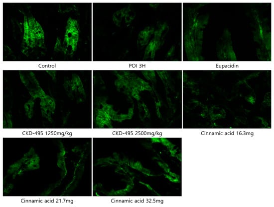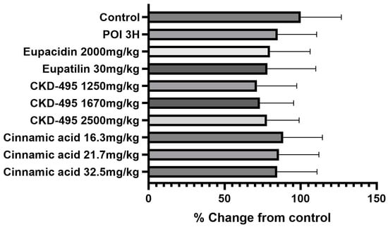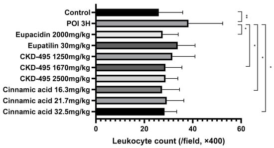The intestinal inflammatory grade was measured using the leukocyte count of the same number of subjects in the permeability study, six subjects in the normal control group, eight in the POI group, six in the eupacidin group, seven in the eupatilin group, six in the CKD-495 doses (1250, 1670, 2500 mg/kg) groups, and five/six/five in the cinnamic acid groups (16.3 mg/kg, 21.7 mg/kg 32.5 mg/kg). Leukocyte counts significantly increased in the POI group compared with the control group (25.95 ± 9.92 vs. 38.23 ± 14.15, p = 0.004) and decreased in all drug groups compared with the POI group (Figure 2).