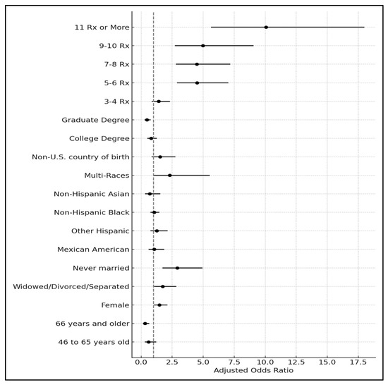 Regarding the number of medications used, patients taking five to six medications were 4.5 times more likely to experience depressive symptoms compared to those taking one to two medications (OR = 4.51, p < 0.001). Similarly, patients using seven to eight medications were approximately 4.5 times more likely to have depressive symptoms compared to those using one to two medications (OR = 4.47, p < 0.001). Patients taking nine to ten medications were five times more likely to have depressive symptoms compared to those taking one to two medications (OR = 4.97, p < 0.001). Finally, patients using eleven or more medications were 10 times more likely to experience depressive symptoms compared to those using one to two medications (OR = 10.06, p < 0.001) (Table 3, Figure 2).