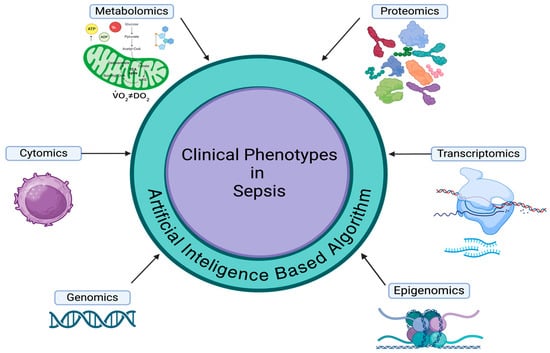 Therefore, given the recent technological advances, the medical community has begun researching part of those mechanisms at both a micro-scale, leading to the study of “Omics”, such as genomics, epigenomics, cytomics, proteomics, metabolomics, and transcriptomics, and at a macro-scale, using various proprietary algorithms and machine learning-based analysis, leading to complex classifications of septic phenotypes [] (Figure 1).