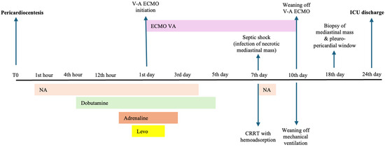 Timeline representation of the main therapeutic interventions during Intensive Care Unit stay (T0 denotes the time of pericardiocentesis). Legend: NA—Noradrenaline infusion; Dobutamine—Dobutamine infusion; Adrenaline—Adrenaline infusion; Levo—Levosimendan infusion; CRRT—continuous renal replacement therapy; V-A ECMO—veno-arterial extracorporeal membrane oxygenation; ICU—Intensive Care Unit.