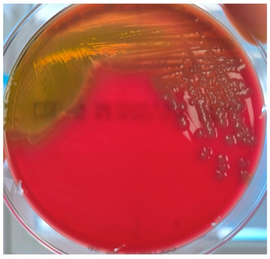 The results from the clinical laboratory on the next day showed CRP of 248 mg/dL, WBC of 2.8 × 109/L, and procalcitonin of 32.8 ng/mL. On the third day, CRP escalated to 372 mg/dL, and the patient presented with leukopenia (WBC 2.13 × 109/L) and showed all the signs of septicemia and septic shock. V. vulnificus was isolated from both blood and wound cultures. The colonies were round and slightly convex, moist, and gray with green β-hemolysis around them (Figure 1).