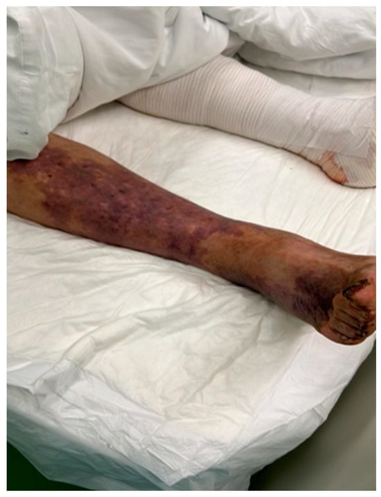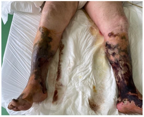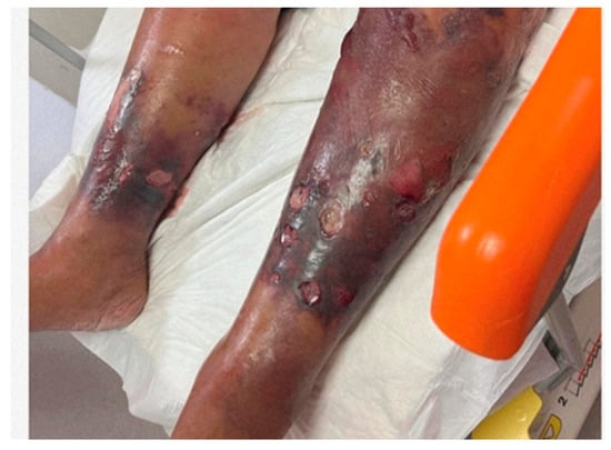 Patient B was an 86-year-old man admitted to our hospital due to the same symptoms—pain, swelling, and bullae on the legs. From the patient’s history, we could see that he had diabetes, alcoholism, and chronic heart failure and had wounds on his legs due to vascular insufficiency (Figure 4).