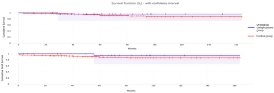 Overall patient (up) and graft survival (down) curves in recipients with urological complications (blue line) and in the control group (red line).