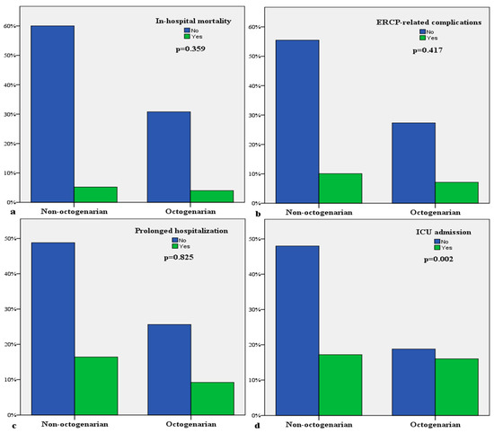 Comparative bar diagrams of clinical outcomes: (a) In-hospital mortality; (b) ERCP-related complications; (c) prolonged hospitalization; (d) ICU admission.