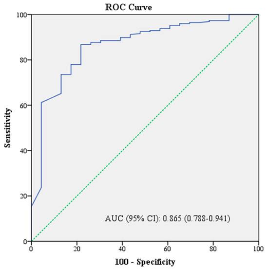 Using the ROC curve, the optimal cut-off value for albumin was determined to be 3.5 g/dL according to Youden’s method. Patients with an albumin value below 3.5 g/dL had a 3.8-fold increased risk of death (OR: 3.8, 95% CI: 1.6–9). In addition, the risk of death was 8-fold higher in patients with malignant etiology (OR: 8, 95% CI: 3.2–19.8) and 7.7-fold higher in those with a qSOFA score of ≥2 (OR: 7.7, 95% CI: 2.5–23.6) (Table 5). ROC analysis was used to assess the predictive performance of the combination of the parameters in the multivariate analysis for mortality. Accordingly, the AUC value of the combination of malignant etiology, hypoalbuminemia, and qSOFA score ≥ 2 was 0.865 (95% CI: 0.788–0.941) for predicting in-hospital mortality (Figure 2).