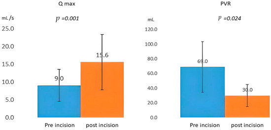 We reviewed the data of 263 patients, of whom 17 were excluded from the analysis; 16 were found to have prostate cancer, and 1 was found to have concomitant urothelial carcinoma. Therefore, a total of 246 patients were enrolled in the study, of whom 110 underwent B-TUEP and 136 underwent thulium laser enucleation of the prostate. The average postoperative follow-up period was 30.2 months; during this period, 23 patients met the indication for cystoscopy, and all 23 were found to have urethral strictures upon cystoscopy examination. The median time from surgery to the discovery of stricture was approximately 4 months. Table 1 presents the distribution of urethral stricture locations among the patients. The membranous urethra was the most common site of urethral strictures, accounting for 69.2% of the cases, followed by the penile urethra (15.4%), bladder neck (11.5%), and the urethra navicular fossa (3.8%). Table 2 presents the results of a comparative analysis of preoperative characteristics between patients with and without urethral strictures. Notably, patients with urethral strictures had a significantly smaller prostate volume and transitional zone volume (p = 0.025) and a significantly higher Qmax than those without urethral strictures (10.6 vs. 8.4 mL/s, p = 0.010). Table 3 lists the perioperative outcomes. The weight of the enucleated specimen was significantly lower in patients with urethral strictures than in those without urethral strictures (11.4 vs. 20.9 g, p < 0.001). Additionally, patients with urethral strictures had a higher trial without catheter (TWOC) failure rate (34.8% vs. 3.1%, p < 0.001) and a higher incidence of postoperative UTIs (65.2% vs. 24.7%, p < 0.001). Patients with and without urethral strictures did not differ significantly in age, creatinine levels, prostate-specific antigen levels, PVR, IPSS, comorbidities, hospital stay duration, enucleated ratio, operating time, or choice of operating method. Table 4 presents the results of both univariate and multivariate logistic regression analyses that were conducted to determine the independent factors associated with the outcome. The parameters analyzed included prostate volume, T-zone volume, Qmax, specimen weight, TWOC failure, and postoperative UTI. The multivariate analysis results indicated that specimen weight (p = 0.036) and postoperative UTI (p = 0.001) were significantly associated with urethral stricture. TWOC failure was also significantly associated with urethral stricture, although the corresponding confidence interval was wider (odds ratio: 9.102 [2.514 to 32.947], p = 0.001). All 23 patients with urethral strictures had undergone cold-knife optical internal urethrotomy (OIU). Figure 1 illustrates the Qmax and PVR results obtained before and after the incision. On average, after the OIU, the patients’ Qmax increased significantly (6.6 mL/s), and their PVR decreased significantly (by 46.9 mL). Thus, the quality of urination improved significantly after the procedure. Of the 23 patients, 21 underwent a single OIU procedure, with an average time to stricture onset of 4 months. Only two patients developed recurrent strictures requiring multiple procedures (one underwent another surgery 3 months after the initial OIU, and the other underwent additional OIU at 6 months and 12 months). Both patients had experienced UTI within 1 month following the enucleation surgery.