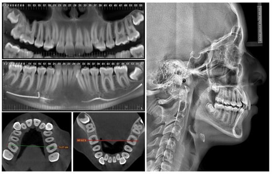 Different clinical and/or radiographic methods can determine transverse discrepancies. The Ricketts PA cephalometric analysis uses frontal teleradiography and is based on the dimensions of the maxillae compared to a table of age-adjusted normative values [21]. The evaluation using Andrews’ element III is based on the transverse correlation of the maxilla and mandible by taking bone and dental reference points (WALA—WALA in the mandible, FA—FA in the maxilla) from the measurement of dental study models [22,23]. Tamburrino et al. (2010) proposed a CBCT-based analysis, as this can visualize bone margins and dental structures without the distortion of frontal teleradiography and can also make it possible to assess hard tissues and dental inclinations not visible in the analysis of the models [24]. In this case, we used the method of Tamburrino et al. (2010), since the same CBCT test would be used to plan the miniscrews. On the other hand, it is important to note the need for more studies correlating the different methods to validate this technique clinically.