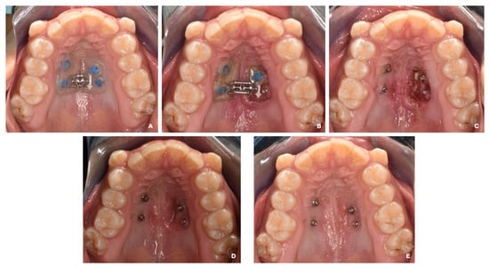 (A) The installation of a MARPE apparatus. (B) Day 14. First clinical check-up. The expander is embedded in the palatal mucosa on the left side. (C) The device is removed, and an ulcer with purulent exudate is observed in the area under the expander. Pharmacotherapy started. (D) A check-up at 7 days with pharmacotherapy. The use of 0.12% chlorhexidine is maintained for two more weeks. (E) A check-up at 30 days. The mucosa is in good condition with total remission of the lesion.