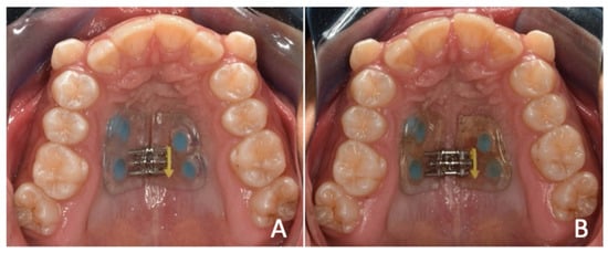 In this regard, hygiene is fundamental to avoiding complications when using this type of device. As observed clinically, this was the fundamental difference between the first device that failed and the second one that succeeded in expanding without complications. To maintain the hygiene and health of the supporting tissues, we irrigated with 0.12% chlorhexidine during the activation process at least once a week on the surface under the acrylic and prescribed the use of a daily oral irrigator in the patient’s normal hygiene routine for the mechanical removal of food. In the stabilization phase, we irrigated the area under the appliance once a month, maintaining the use of the oral irrigator in the patient’s daily hygiene.