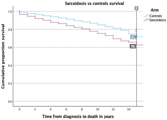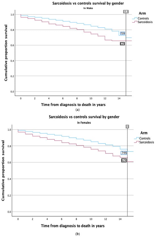 Kaplan–Meier survival curves illustrating the comparative mortality between sarcoidosis patients and healthy controls are presented in Figure 1. The survival analysis revealed a significantly lower 15-year survival rate in the sarcoidosis group, at 62%, compared to 72% among controls. This trend of reduced long-term survival persisted across both genders. Specifically, among males, the survival rate was comparable to the overall cohort analysis (as depicted in Figure 2a). Conversely, the disparity was more marked in females; only 62% of female sarcoidosis patients reached the 15-year survival mark, whereas 74% of female controls did so, highlighting a pronounced gender-specific impact (refer to Figure 2b).
