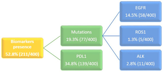 The demographic and clinical characteristics of the entire sample are represented in Table 1. Regarding molecular characteristics, almost 53% of the cases presented any biomarker, the most frequent being the expression of PDL1 in 35% of the cases and the EGFR gene mutation in 14% (Figure 1).