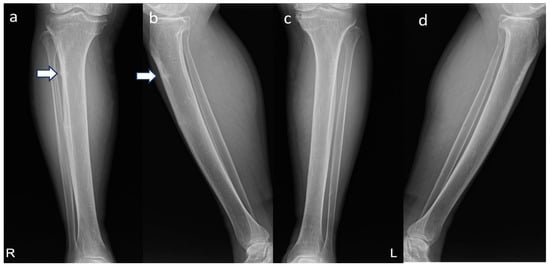 Preoperative radiographs of both tibiae. (a) Anteroposterior (AP) view of the right tibia showing cortical thickening and a short, horizontal radiolucent fracture line in the anterolateral cortex of the proximal tibia (white arrows). (b) Lateral view of the right tibia demonstrating the same findings. (c) AP view and (d) lateral view of the left tibia showing no abnormal findings.
