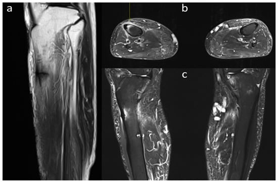 MRI also revealed cortical thickening in the anterolateral aspect of the left mid-shaft tibia, along with a horizontal fracture line. Edema was observed around the insufficiency fracture line (Figure 2).