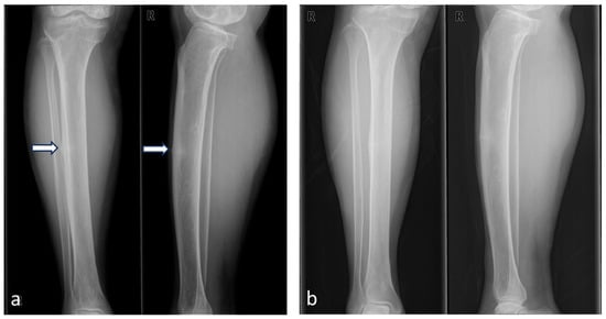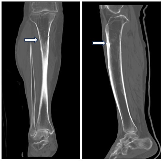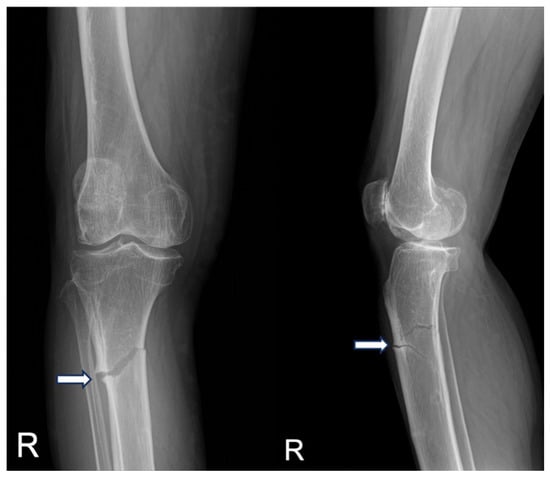 Osteoporosis is increasing as a result of longer life spans and an aging population []. The use of bisphosphonate drugs has been increasing for the treatment of osteoporosis. These drugs are generally regarded as relatively safe []. An association between long-term use of the anti-bone resorptive agent bisphosphonate and atypical insufficiency fractures of the femur has been well documented []. In a recent large cohort study, it was found that patients on bisphosphonates for over 8 years were more than 40 times more likely to develop atypical femoral fractures compared with patients with less than 1 year of usage []. It has been suggested that the higher incidence of atypical femoral fractures in patients with high adherence to bisphosphonate therapy indicates that this drug may play a significant role in the pathogenesis of these fractures []. Fractures in other long bones such as the tibia have only rarely been reported [,]. As a result, in clinical settings, the diagnosis of atypical tibial fractures is frequently delayed, leading to suboptimal treatment outcomes. Recognizing that atypical fractures can also be present in the tibia underscores the need for discussions on precise diagnostic strategies and effective treatment approaches. This paper aims to provide clinically relevant insights and contributes valuable knowledge to the field.