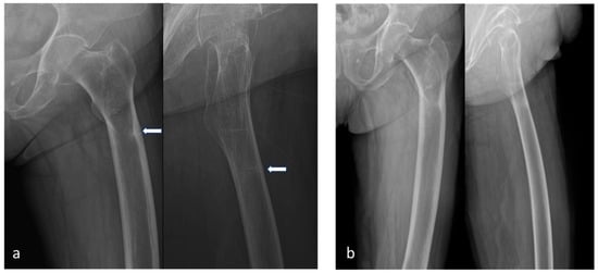 - Odvina, C.V.; Levy, S.; Rao, S.; Zerwekh, J.E.; Rao, D.S. Unusual midshaft fractures during long-term bisphosphonate therapy. Clin. Endocrinol. 2010, 72, 161–168. [Google Scholar] [CrossRef] [PubMed]