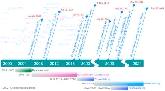 Timeline of the patient’s osteoporosis treatment history and the occurrence of atypical fractures from 2002 to 2024. The chart details the sequence of anti-osteoporotic medications prescribed and the timing of key fracture events over a 22-year period.