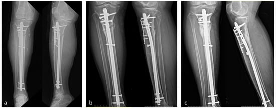 Sequential radiographs demonstrating the progression of fracture healing following intramedullary nailing and supplementary plating of the right proximal tibia. (a) Immediate postoperative radiograph showing the Tibial Nail and 1/3 Tubular Plate in place. (b) Three-month follow-up radiograph revealing initial signs of fracture healing. (c) Eight-month follow-up radiograph demonstrating significant progression of fracture union with callus formation.