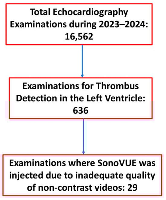 Patient Selection Flowchart. A total of 16,562 echocardiography examinations were performed in our echocardiography unit from 2023 to 2024. Among these, 636 examinations were conducted specifically to assess for thrombus in the left ventricle. In 29 of these cases, the echocardiography contrast agent SonoVue was injected due to insufficient video quality.