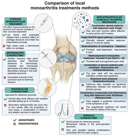 Advantages and disadvantages of local monoarthritis treatments. Created with BioRender.com (accessed on 4 July 2024).