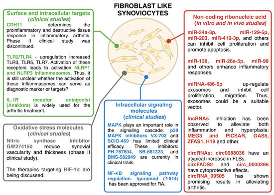 In RA, fibroblast-like synoviocytes have intrinsic pathogenic properties and actively contribute to the disease process. They proliferate and promote joint destruction by stimulating inflammation. However, the reasons why they turn from beneficial to harmful in RA remain to be fully understood. Studies have shown that persistent inflammation can induce molecular changes in FLSs that transform them from passive responders to inflammation to active aggressors [48,49]. RA FLSs have specific characteristics that distinguish them from healthy FLSs. These characteristics remain unchanged even when RA FLSs are isolated from an environment rich in inflammatory cytokines [11,49]. Potential therapeutic strategies could target FLS surfaces and intracellular proteins, FLS metabolism, and signaling pathways that increase FLS invasive and migratory potential, non-coding ribonucleic acid, oxidative stress molecules, etc. Current therapeutic approaches focus on modifying the immune response, specifically by targeting pro-inflammatory cytokines, B cells, or T cells [50]. Some of these drugs may also influence the invasive behavior of FLSs, especially those that inhibit cytokines or signal transduction pathways [51,52]. Although these drugs can reduce the level of FLS activity in RA, they may not always be effective, which is why patients still suffer from this disease. In such cases, the use of a combination of alternative or complementary therapies may be useful to manage the disease effectively. Potential therapeutic targets related to FLS are described in Figure 2 and the following sections.