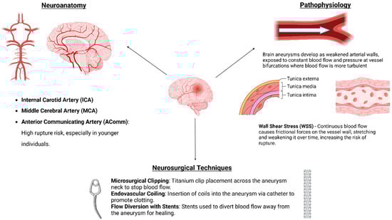 A summary figure illustrating key points about aneurysm anatomy, pathophysiology, and neurosurgical treatment.