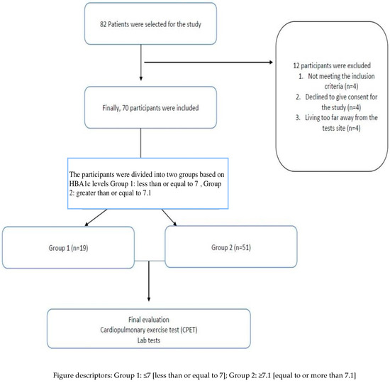 This was a cross-sectional study in which the population was divided into two groups based on HBA1c values (≤7 (group 1; G1) and ≥7.1 (group 2; G2)) to examine the effects of glycaemic control on CRF parameters. There were 19 participants in group 1 and 51 participants in group 2. The flow chart for the patients is shown in Figure 1.