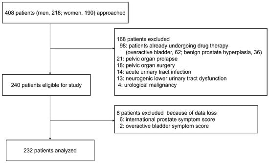 This study was approved by the Nagasaki University Hospital Ethics Committee (#20122138) and conducted in accordance with the principles of the Declaration of Helsinki. Written informed consent was obtained from all participants. Based on the OABSS, participants with urinary urgency (Question [Q] 3 score ≥2 and total score ≥3) were considered to have OAB [13].
