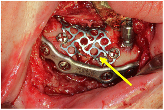 Figure 2. Open reduction and internal fixation of a mandibular fracture using a 2.0 mm thick mandibular locking plate with a 2 mm screw diameter. The yellow arrow points to the autologous bone graft obtained from the mandibular ramus and covered by a titanium mesh.