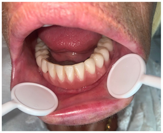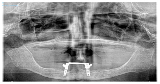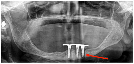 Patients with mandibular atrophy can benefit from dental implant treatment. Subsequent to dental implant placement, one of the possible prosthetic solutions could be the use of implant-retained overdentures, with a success rate ranging from 80% to 100% [2,3,4]. Despite the high rate of osseointegration of the implants and the good functioning of overdentures, complications may arise. Infections, improper implant placement, bleeding, or mandibular fractures should be kept in mind when treating these patients. The incidence of mandibular fractures, in this specific situation, is very low (0.05–0.2%) [2,5,6,7], and few cases have been reported in the literature. The etiology of the fracture is usually due to trauma or peri-implantitis, and their consequences can be severe [5,8], including osteomyelitis, paresthesias/dysesthesias, pseudoarthrosis, and long-term nutritional problems [2].