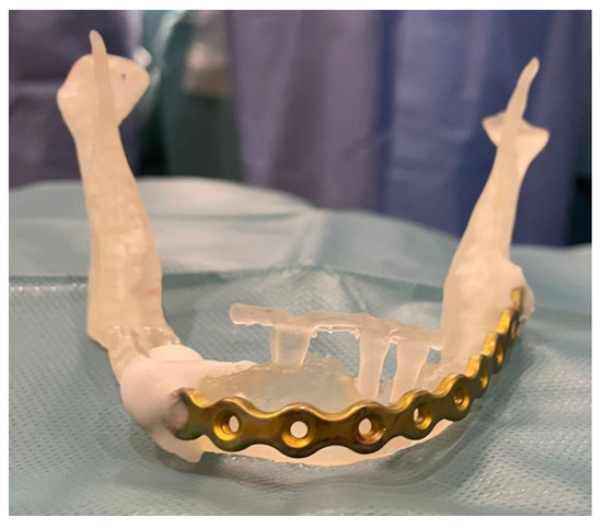 Figure 5. Three-dimensional biomodel with pre-adapted 2.5 mm thick mandibular locking plate with 2.4 mm screw diameter.