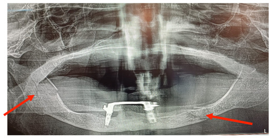 Figure 9. OPG image: bifocal atrophic mandibular fracture (red arrows point to fractures of the left mandibular body and the right mandibular ramus).