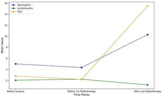 Overlay of mean trends for neutrophils, lymphocytes, and NLR across treatment stages.
