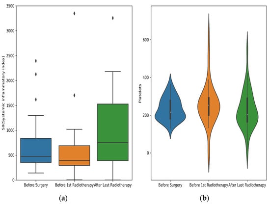 Boxplot for SII across treatment stages: pre surgery, pre radiotherapy, and post radiotherapy (a); violin plot for platelets across treatment stages: pre surgery, pre radiotherapy, and post radiotherapy (b).