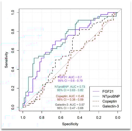 Blood samples were collected at the time of admission in serum separator tubes with a clot activator (BD Vacutainer CAT) and permitted to clot at room temperature for no more than 2 h. Afterwards, they were centrifugated for 15 min at 1000× g to obtain serum. The samples were isolated into Eppendorf tubes and stored at −80 °C until they were analyzed. The NT-proBNP analysis was carried out by an electrochemiluminescent immunoassay (Roche Diagnostics, Mannheim, Germany). The serum concentration of the biomarkers were assessed through a quantitative enzyme-linked immunosorbent assay (ELISA): FGF21(Catalog No E-EL-H0074, sensitivity 18.75 pg/mL, detection range: 31.25–2000 pg/mL, Elabscience Biotechnology Inc., Houston, TX, USA), Galectin-3 (Catalog No E-El-H1470, sensitivity 0.1 ng/mL, detection range 0.16–10 ng/mL, Elascience Biotechnology Inc., Houston, TX, USA), Copeptin (Catalog No E-EL-H0851, sensitivity 18.75 pg/mL, detection range 31.25–2000 pg/mL, Elabscience Biotechnology Inc., Houston, TX, USA).