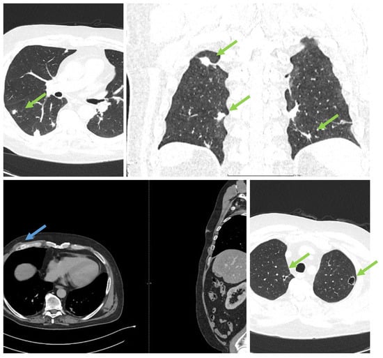 CT with contrast, showing disseminated lesions in the lungs, abdomen, and soft tissues (the green arrows indicate disseminated abscesses, blue arrow indicates drained abscess).