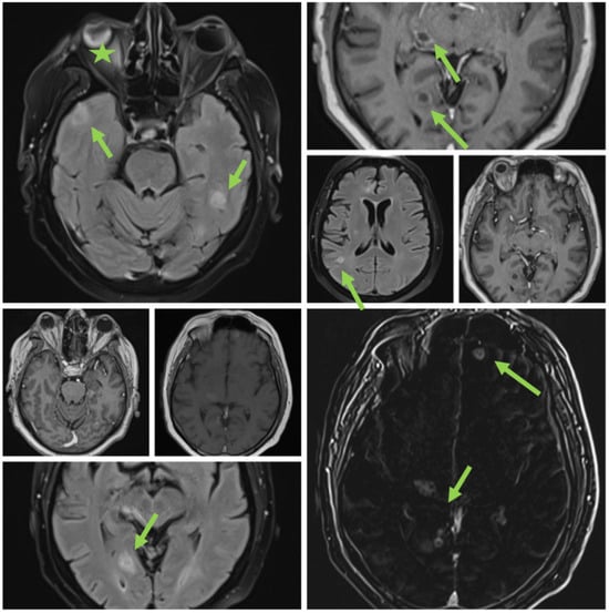 MRI. (Ring-enhancing lesions are present in all cerebral lobes and the thalamus. Different sequences showing brain abscesses are indicated by green arrows; the star indicates eye involvement).