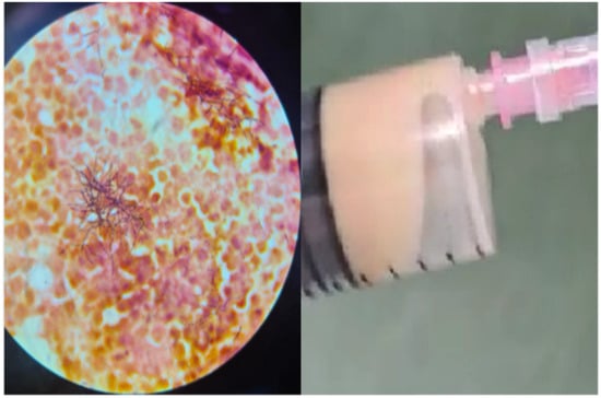 Macroscopic aspect of the evacuated subcutaneous abscess (right) and microscopic aspect with ramified filamentous Gram-positive bacilli growing in an aerobic environment (left).
