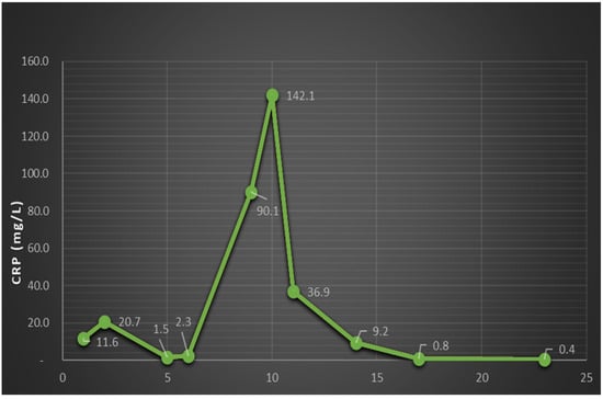 CRP level dynamics (the spike indicates meropenem withdrawal and corroborates with the sharp increase in headache intensity and retroorbital pain).