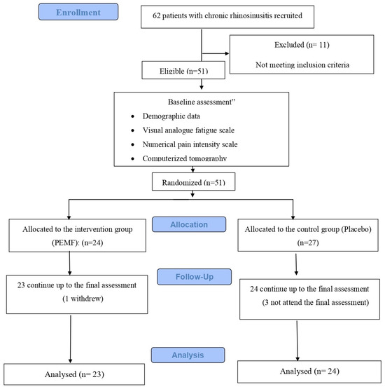 Forty-seven patients of both genders, aged 19 to 40, participated in the current research. The participants were recruited from the Ear, Nose, and Throat (ENT) department of Kasr El-Aini Teaching Hospital in Egypt, and the PEMF intervention was administered by the physiotherapist in the Faculty of Physical Therapy’s outpatient clinic at Cairo University. An ENT consultant assessed all eligible patients to confirm the diagnosis of CRS through a detailed medical history and the independent evaluation of each patient’s SNOT-22 score. All patients were also examined using 0° and 30° rigid endoscopes to confirm the diagnosis further. A CT scan was then performed for each patient, and the Lund–Mackay score was applied to evaluate the scans, with each patient receiving an individual score. The trial admitted subjects with mild-to-moderate symptoms [31], without providing any medication or physical interventions. The study excluded individuals with nasal polyps, a deviated nasal septum, surgery within the last six months, pregnancy or lactation, diabetes mellitus, high blood pressure, cancer, active pulmonary tuberculosis, respiratory disorders, and long-term use of corticosteroids. Furthermore, individuals who had participated in another clinical trial within the previous 30 days, those who were unable to adhere to their treatment plan, and those who had used antihistamines for less than one week, topical corticosteroids, and non-steroidal analgesics for less than two weeks, systemic corticosteroids for less than four weeks, or anti-cholinergic decongestants or other drugs within the previous three days were excluded from the study [32]. We explained the study’s aim and methodology to the participants and obtained written consent from each eligible participant before beginning the study.