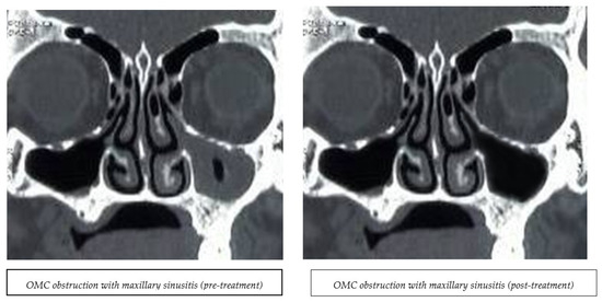 Computerized tomography scanning examinations were conducted at a radiological center before and after the treatment’s completion. The results obtained from the CT films revealed sinus opacification and ostiomeatal complex obstruction. Figure 2 displays the CT findings’ pre- and post-values. The Lund–Mackay score was assessed before and after the study’s completion.