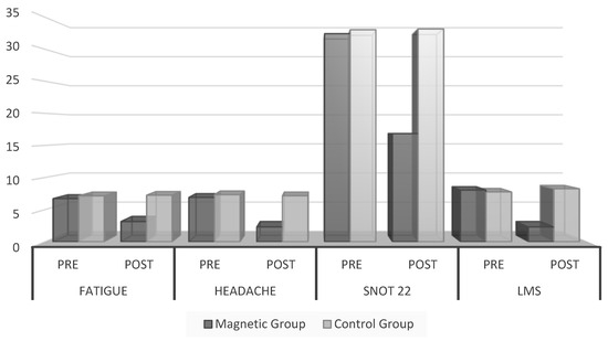 Comparison between groups’ pre- and post-values of fatigue, headache, SNOT 22, and LMS.