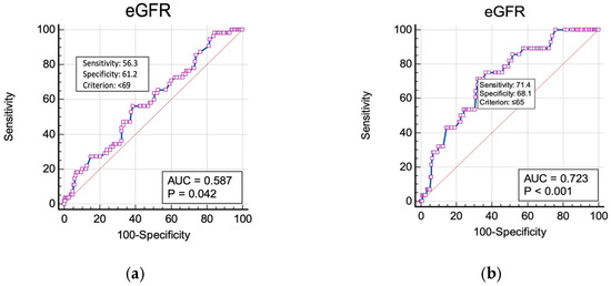 The ROC curve analysis of eGFR as a predictor for UTIs with MDR isolates demonstrated a sensitivity of 56% and a specificity of 61% (AUC = 0.587, p = 0.0419) at an eGFR threshold <69 mL/min/1.73 m2 (Figure 1a). Likewise, the ROC curve analysis of eGFR as a predictor for UTIs with ESBL isolates showed a sensitivity of 71% and a specificity of 68% (AUC = 0.723, p < 0.001) at an eGFR threshold <65 mL/min/1.73 m2 (Figure 1b).