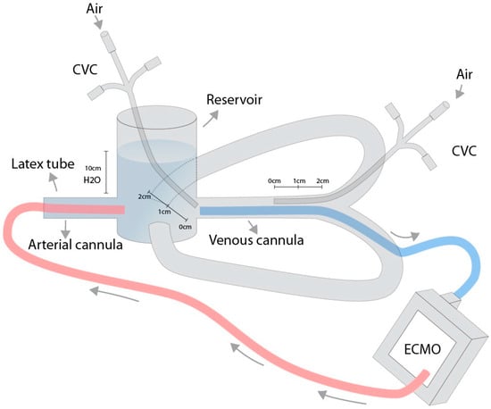 3]. The temperature of the mixture was maintained with an integrated heating unit (HU 35, Maquet, Getinge Group, Rastatt, Germany). A reservoir was filled to 10 cm to simulate a central venous pressure of 10 cm of water. Latex tubing with an inner diameter of 10 mm and a wall thickness of 1 mm was used to simulate vessels inserted at the bottom of the reservoir. Maquet Cardiohelp (Maquet, Getinge Group, Rastatt, Germany) and HLS Set advanced 7.0 (Maquet, Getinge Group, Rastatt, Germany) were used for ECMO. A multi-stage venous cannula (venous HLS cannula 23 Fr, 55 cm (Maquet, Getinge Group, Rastatt, Germany) and a single-stage arterial cannula (arterial HLS cannula 17 Fr, 15 cm (Maquet, Getinge Group, Rastatt, Germany) were inserted into the reservoir through latex tubing. The pressures at the tip of the central venous catheter were measured using a TruWave (3cc) VAMP Plus (215 cm) (Edwards Lifesciences, Irvin, CA, USA) pressure monitoring set and an IntelliVue MX750 (Philips, Amsterdam, Netherlands) patient monitor.
