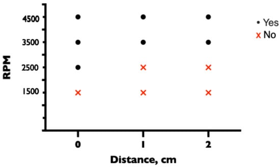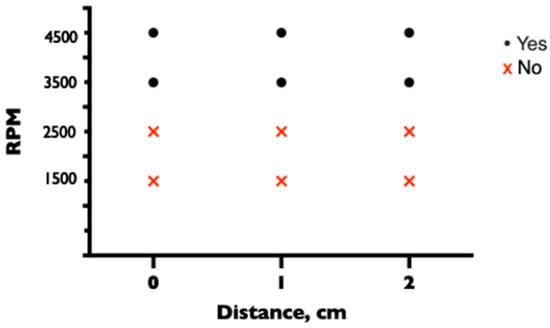 When the tip of the CVC was positioned adjacent to the proximal side hole of the drainage cannula, the protection of the CVC with a three-way stopcock or clave was sufficient to prevent air entry at all pump speeds and positions. When the lumen of the CVC was left open, air entered the ECMO circuit at 3500 and 4500 rpm at all distances between the proximal side hole of the drainage cannula and the CVC of 0, 1, or 2 cm. At lower pump speeds of 1500 and 2500 rpm, no air entered through the unprotected lumen, regardless of the distance between the tips (