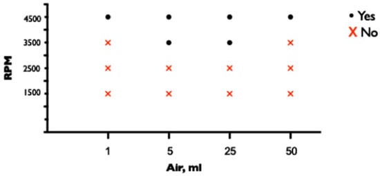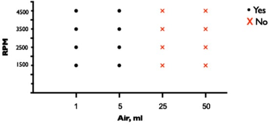 ECMO flows ceased completely when either 25 or 50 mL of air was injected into the drainage cannula at each of the pump speeds tested (