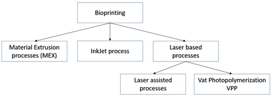 Without a doubt, bioprinting represents a groundbreaking tissue engineering (TE) approach with immense potential as a platform for constructing and fabricating in vitro tissues. Almost all the current bioprinters make use of traditional, well-established additive manufacturing (AM) technologies like material extrusion (MEX) and vat photopolymerization (VPP) [63]. Regardless of the printing process, all printers use bioinks with different, process-specific material properties such as viscosity, density, and adhesion requirements. Moreover, process parameters like printing speed, temperature, material deposition rates, and laser power also need to be adjusted depending on machine type and component fabrication (Figure 2).