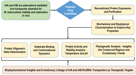 The following flowchart shows the research method for carrying out biophysical and biochemical characterization as well as the evaluation of evolutionary linkage for IrtA and IrtB-Rv2895c (Figure 1). In addition to offering important insights into drug development, the procedure seeks to further our understanding of the therapeutic potential of transporter proteins.